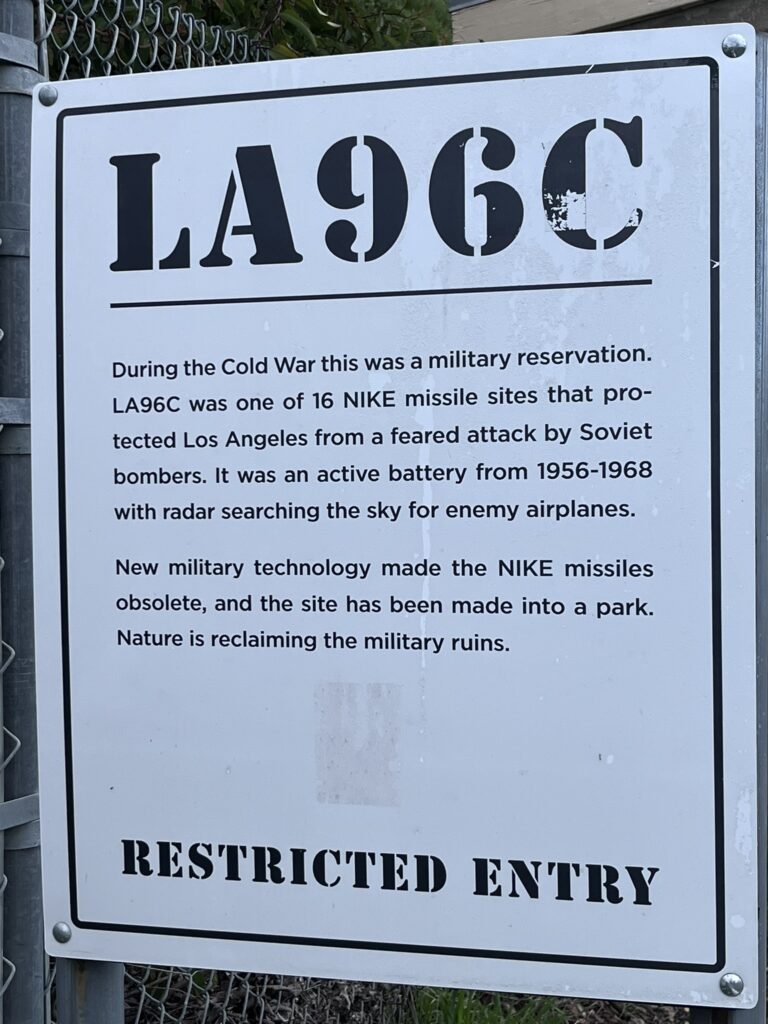 “Let’s hike up to the missile installation,” said Matt Brownlie, which we did. Decommissioned anti-missile battery which protected LA during the Cold War. What a view. What a world.